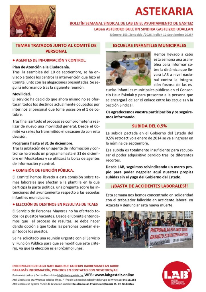 El sindicato LAB seguirá luchando -sindical, social y jurídicamente- para resolver estos casos y otros que pudieran existir de forma adecuada y digna, poniendo en el centro la salud laboral de los trabajadores y trabajadoras.