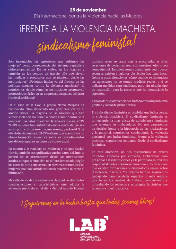 NOTICIAS Frente a la violencia machista, ¡SINDICALISMO FEMINISTA! 24 de noviembre de 2025 Tags: NOTICIAS Sigue leyendo Anterior Entrada anterior: Astekaria 163