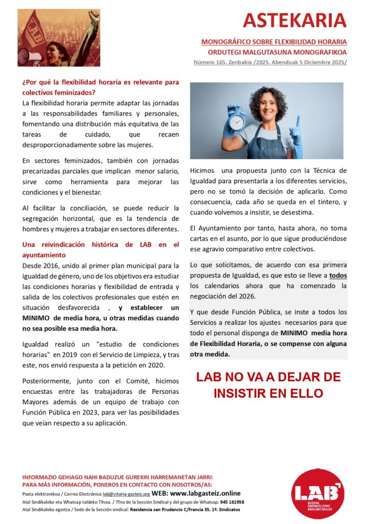 El sindicato LAB seguirá luchando -sindical, social y jurídicamente- para resolver estos casos y otros que pudieran existir de forma adecuada y digna, poniendo en el centro la salud laboral de los trabajadores y trabajadoras.