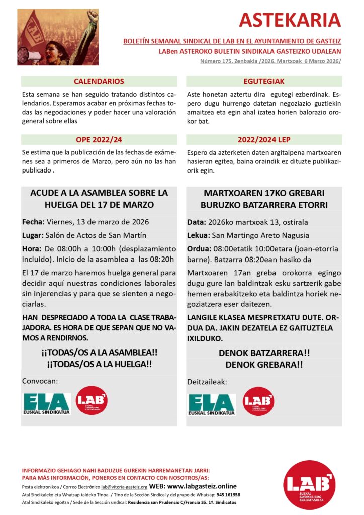 Emaitza horiek ematen duten bermearekin, LABek Osakidetzako langile guztiak defendatzen jarraituko du, sindikalismo borrokalaria eginez eta osasun-sistema publiko indartsu baten alde borrokatuz, plantillaren eta osasun publikoaren etorkizuna jokoan dagoen lekuetan.