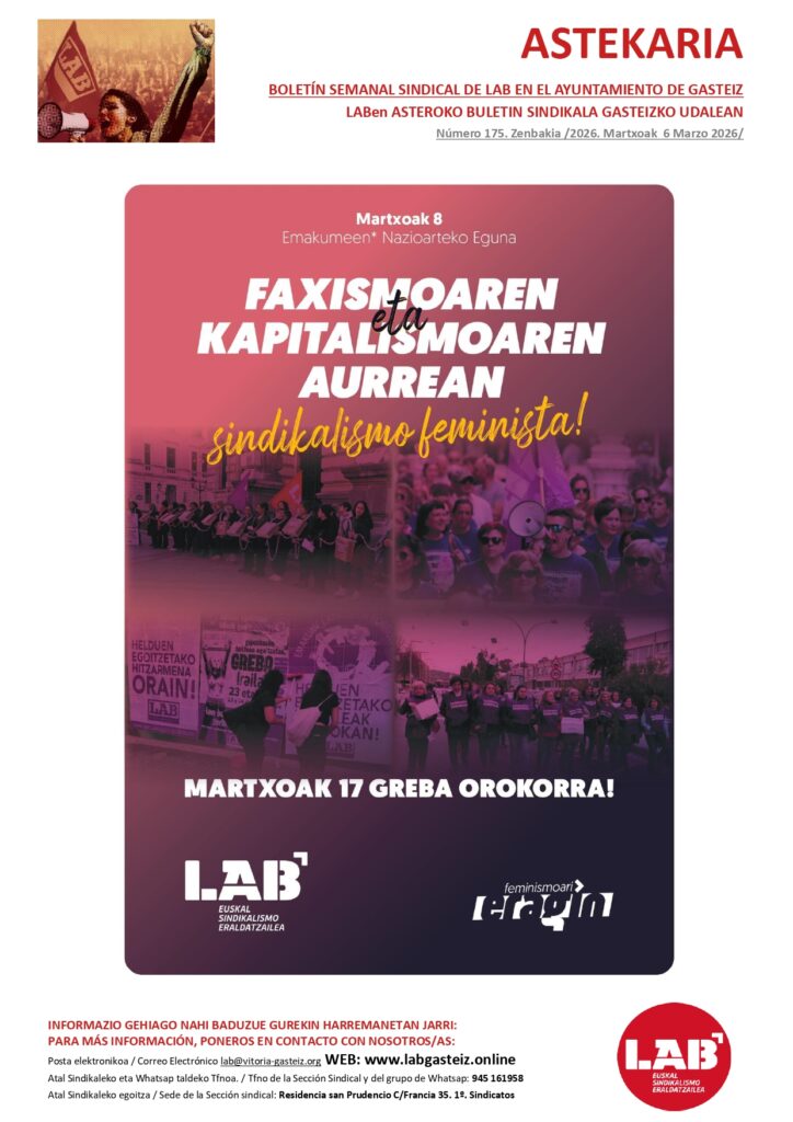 El sindicato LAB seguirá luchando -sindical, social y jurídicamente- para resolver estos casos y otros que pudieran existir de forma adecuada y digna, poniendo en el centro la salud laboral de los trabajadores y trabajadoras.