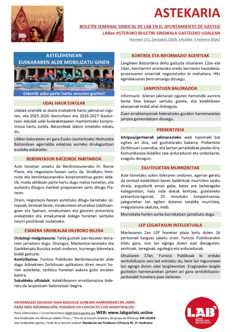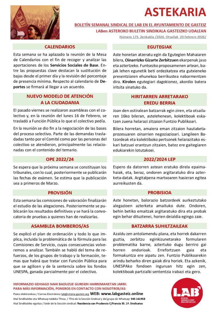 1 min read ALBISTEAK ASKI DA! MARTXOAK 17 GREBA OROKORRA! 13 de martxoa de 2026 Hemen erabaki eta hobetu nahi ditugu gure lan baldintzak.Leer Más / Gehiago irakurri