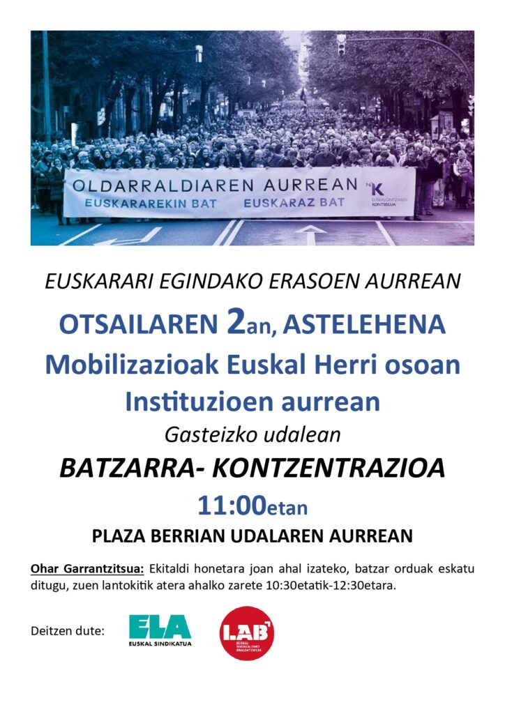 Ekitaldi honetara joan ahal izateko, batzar orduak eskatu ditugu, zuen lantokitik atera ahalko zarete 10:30etatik-12:30etara.